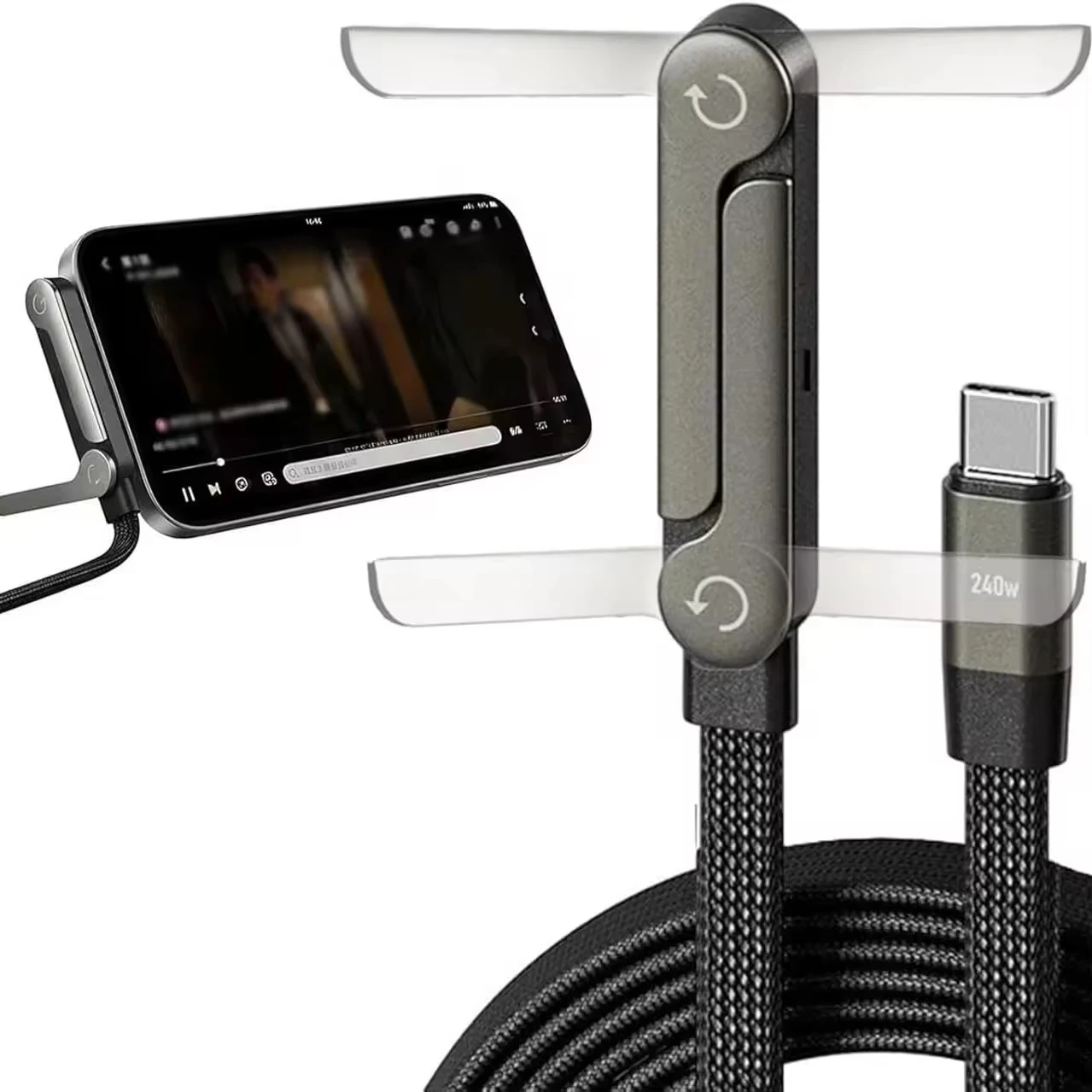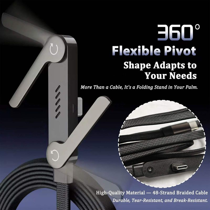 2026 Hot Selling Stand Fast Charging Cable 5ft 240W Type-C Data Cable with Phone Stand Braided lbow 360° Rotation Multi - Angle for iphone Tablets