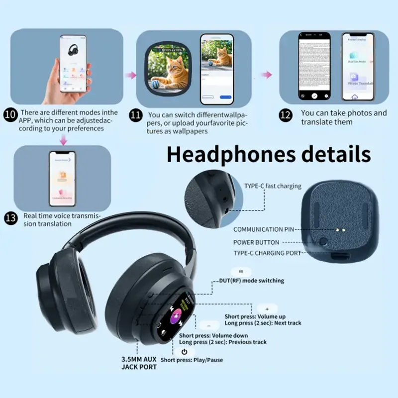 X1 Pro Wireless Headphones with Detachable Full Color LCD Touch Screen Support 115 Languages Bluetooth Translation Function AI Assistant & Smart Chat